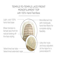Statement Style from the Signature Collection by Raquel Welch features a long, softly tapered silhouette reflecting "undone glamour." Soft waves at the crown and sides become slightly tighter at the ends, giving it a modern edge. The long layers throughout give the overall appearance of a one-length cut, while keeping the style light with the perfect amount of body. The lace front monofilament top allows for a natural hairline and different parting options, while the hand-tied cap offers a comfortable, cool fit.